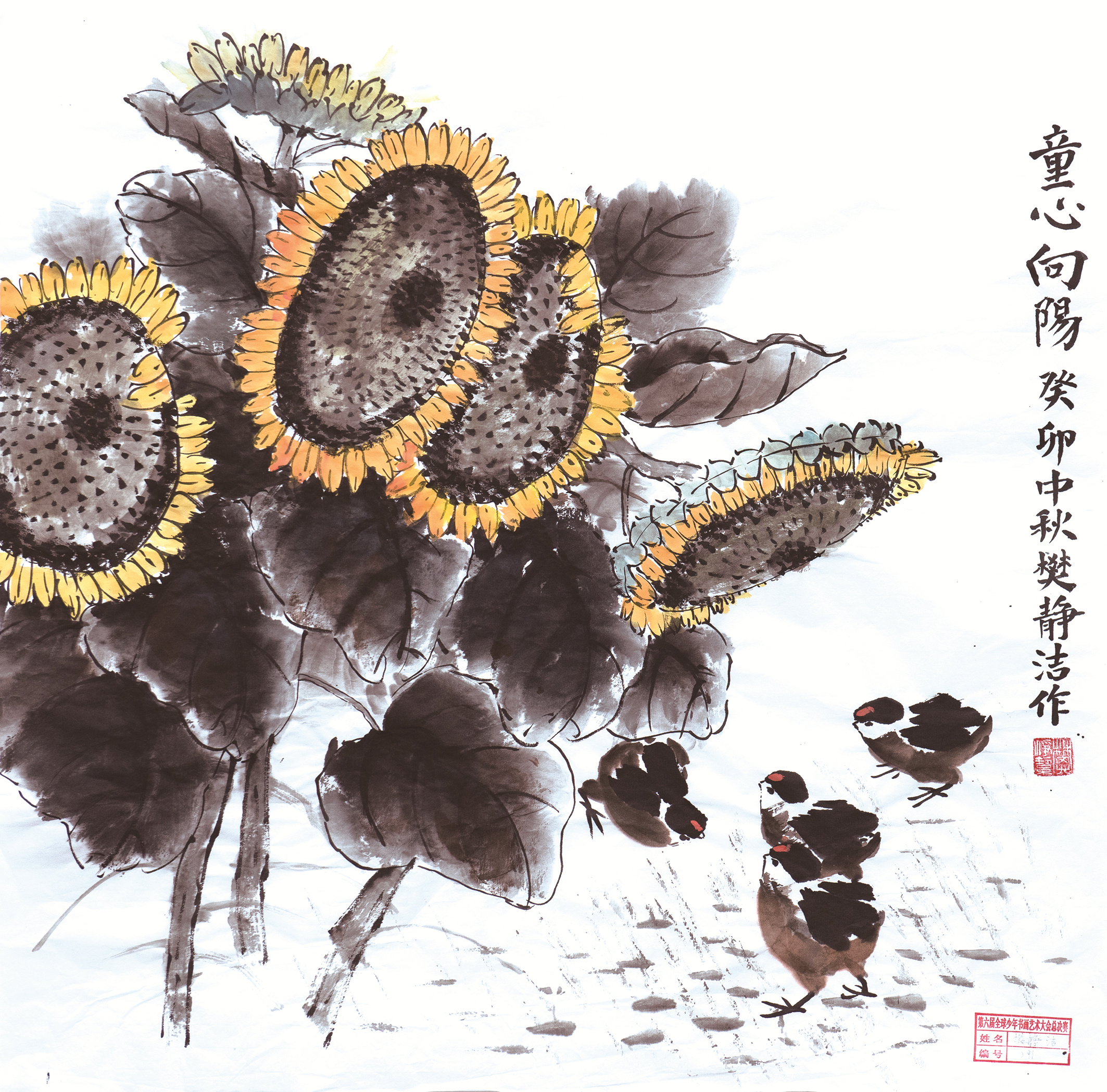 作品释文:深秋时节百花凋谢,唯有菊花不畏雪压霜欺,此图写菊花的风姿,表达画家不怕困难勇往直前的精神